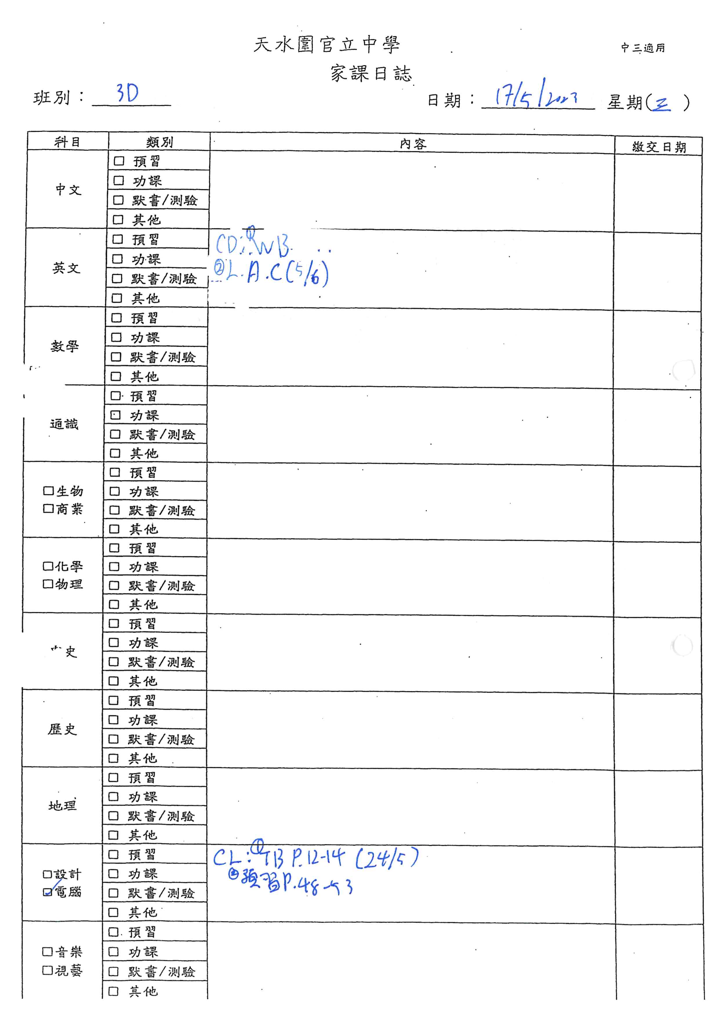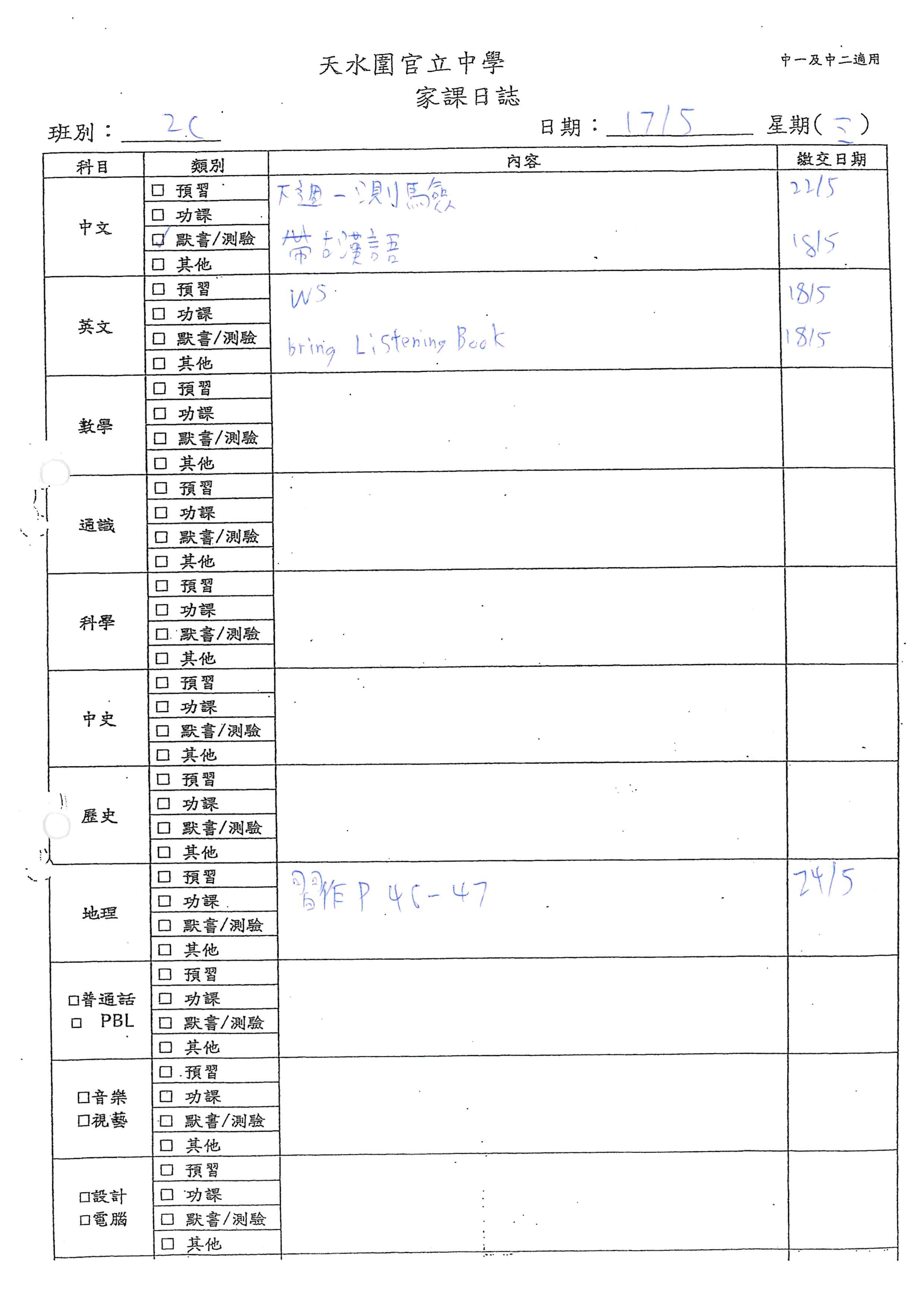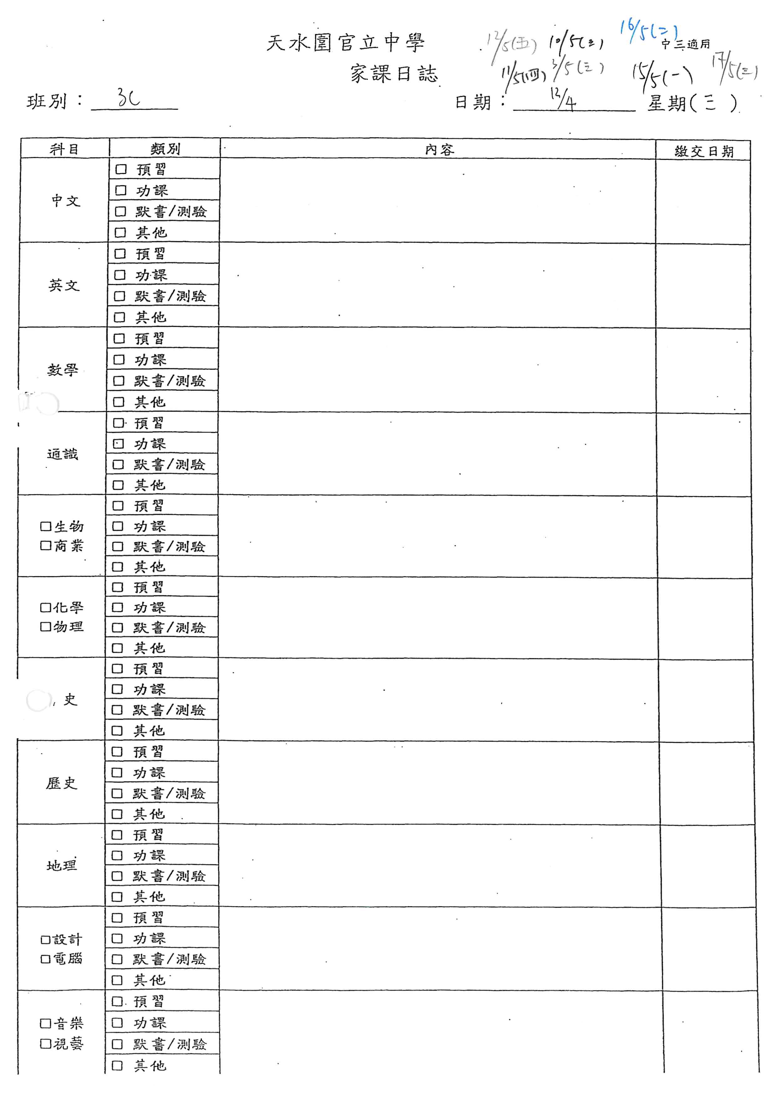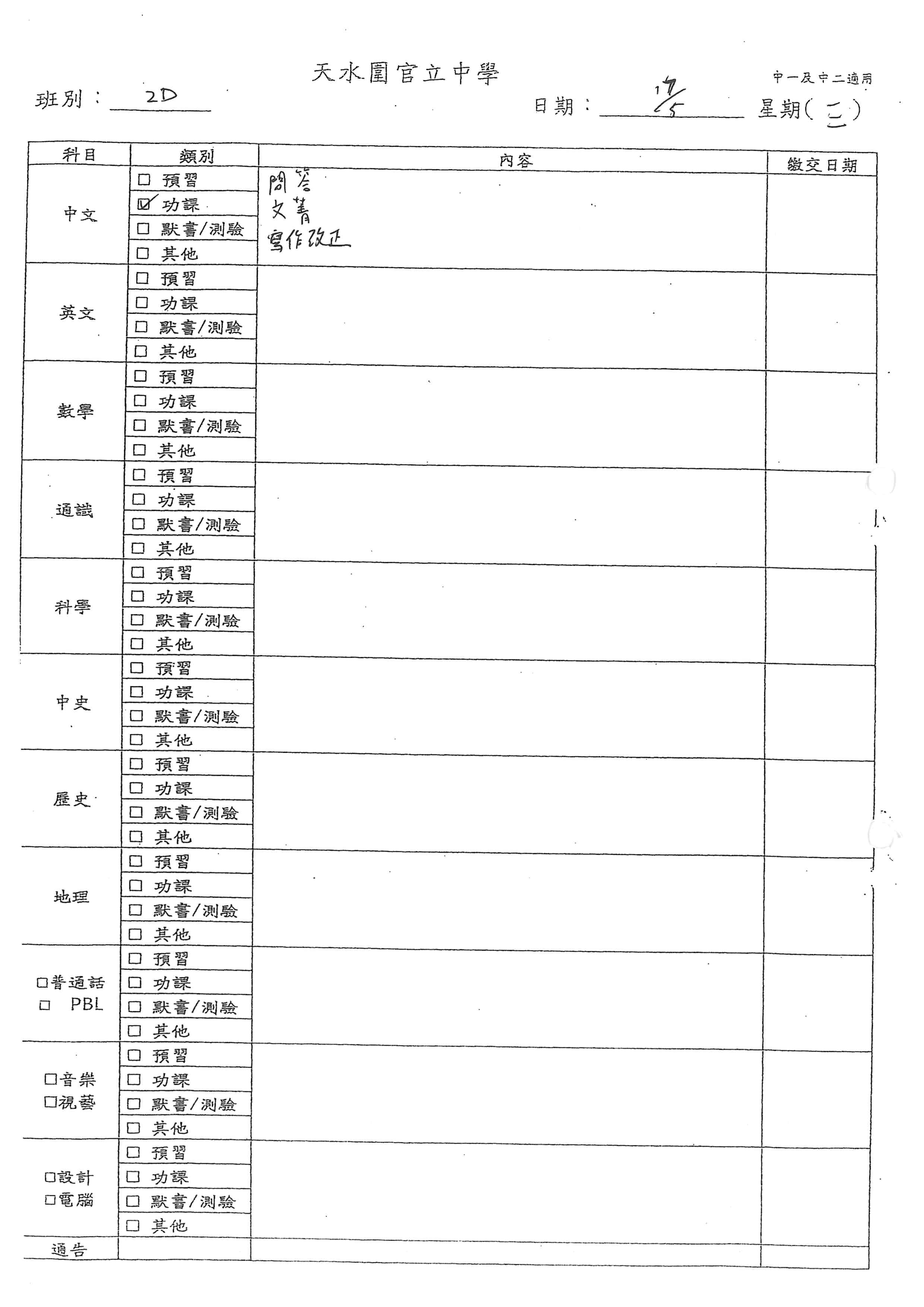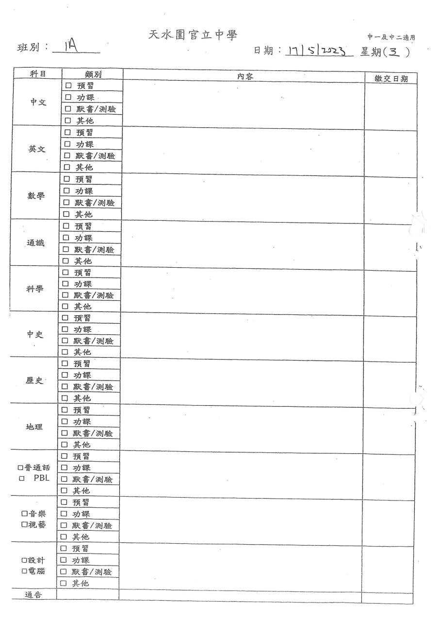 初中家課表